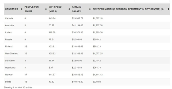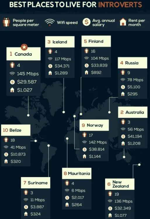 澳大利亚排在第二位,基本与加拿大持平,尽管它在无线网络速度上只有加拿大的三分之一,但平均年薪却比加拿大更高,达4.1万美元,而每平方公里的居民人数却仅为3人,因此也是十分适合性格内向者生活的。其他的前十名国家依次为冰岛、俄罗斯、芬兰、新西兰、苏里南、毛里塔尼亚、挪威和伯利兹。