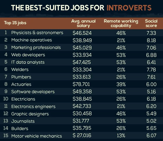 同时,报告也公布了适合性格内向人士的工作以及内向人士梦寐以求的工作。根据报告,适合内向人士的最佳工作前十名,为:物理学家和天文学家、机器操作员、营销专业人士、网站开发人员、IT数据分析师等。