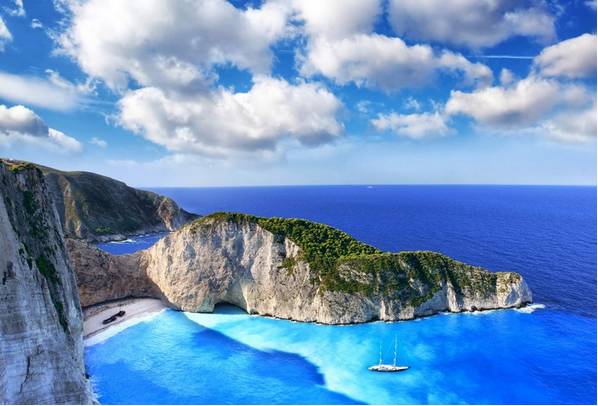 沉船湾是希腊扎金索斯最著名的景点。1983年,走私船Panagiotis号在运送香烟时失事搁浅于此,该地自此得名“沉船湾”。陡峭的悬崖、清澈蔚蓝的海水、洁白的沙滩间,鬼斧神工地横着一条锈迹斑斑的老铁船,为游客带来视觉上的极大震撼,也为这里增添了许多的历史感与神秘感。希腊诗人狄奥尼修斯说:这里是让人忘记天堂的地方。