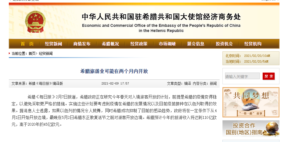 继2月4日希腊总理米佐塔基斯在接受路透社采访时称,预期今年夏天希腊旅游业将会强劲反弹的利好消息传来之后,关于希腊放开国境管控,又有好消息传来:希腊《每日报》报道,希腊政府正在研究2021年春天开放旅游业的计划,如果希腊能够成功克服目前疫情浪潮,那么政府愿意从4月1日开始在一定条件下开放国门,放松对入境旅客的限制,如果不是从4月1日开始,那么在接下来的几周内也会启动,最晚在5月2日希腊东正教复活节之前。而且预计希腊今年的旅游收入为110亿欧元,高于去年的45亿欧元。