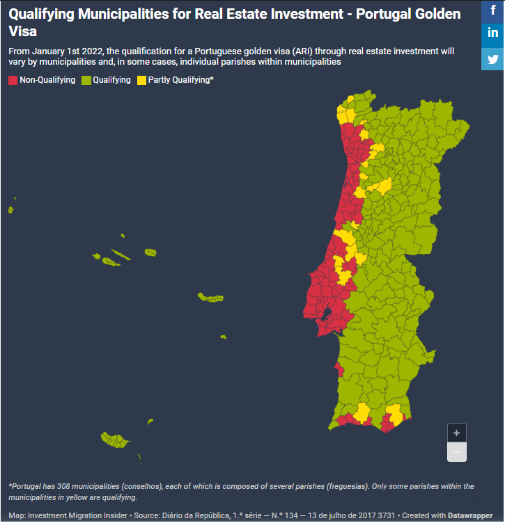 葡萄牙黄金居留新政中,对中国投资人而言,影响最大的应该算是房地产投资范围的缩减一项:50万欧以上住宅类房产或35万欧以上翻新住宅类房产,只能在内陆地区、马德拉群岛和亚速尔群岛购买。