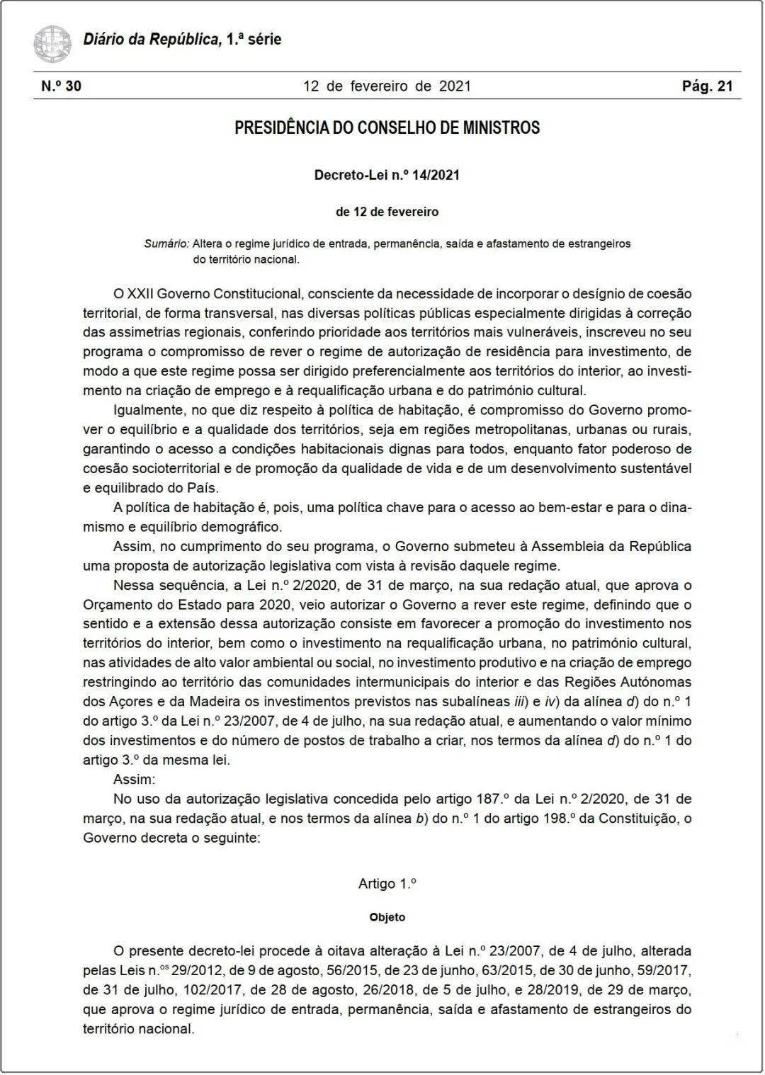 当地时间2月12日,葡萄牙政府发布了2021年第14法条,公布了2020年12月22日部长会议批准通过的《黄金居留修正案》将从2022年1月1日正式生效,这是葡萄牙投资移民法案有史以来第一次在本质上的变迁! 修正案明确了葡国黄金签证移民项目的诸多新政细节,例如:提高了基金投资门槛,缩小了购房移民的地理范围等等。