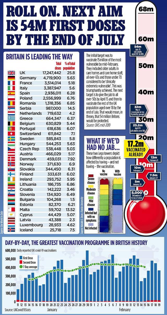 英国卫生大臣在2月21日表示,首剂疫苗将病毒传播减少约三分之二。英国将在7月底前为所有在英国居住的人接种疫苗,50岁以上人群将在4月15日之前完成接种,预计将在5月6日为前九大优先群体完成疫苗接种。