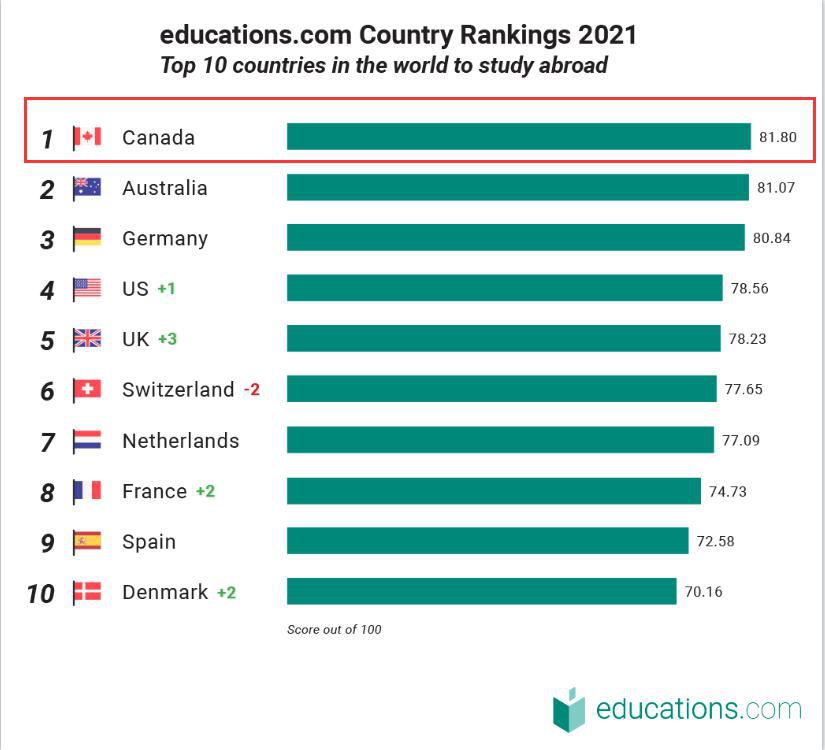 在上个月,全球高等教育咨询网站education.com发布了《2021年全球十大最佳留学国度》排名。其中,加拿大以81.80分雄踞榜首,这也是加拿大继2020年后第二次夺冠。