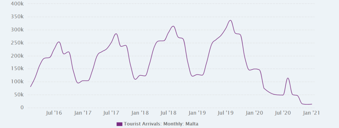 从2016年1月至疫情之前的数据显示,到马耳他旅游的人数是逐年上升的趋势,2019年8月,这一数据达到了336547人的历史高点。根据SchengenVisaInfo.com的报道,自2020年3月起,因受到疫情的影响,马耳他旅游业遭受到沉重的打击,为了恢复马耳他旅游业,政府采取了一系列积极举措。例如:马耳他政府早前宣布,他们计划在6月1日前解除国内大部分地区的限制和其他禁令,此举将有助于恢复旅游业。近期,马耳他旅游部长克莱顿·巴托洛(Clayton Bartolo)已展开新一轮的补贴计划: