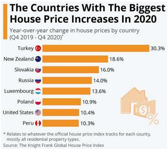 其中,不少新兴市场表现强劲,房价连续四个季度上升的土耳其就是其中之一。数据显示,土耳其房价去年第四季度涨幅为5.5%,位居全球榜首,而年涨幅更是达到了近30%。相比较国内地区的房价,去年第四季度房价同比2019年,仅仅略增3.8%……