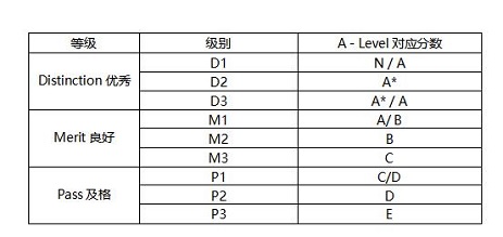 Pre-U课程体系的评分制度与其它体制稍有不同,每门课程的评分可分为三个等级(Distinction优秀, Merit良,Pass及格),每个等级还分为3种级别,因此每门课共有9项评分级别。