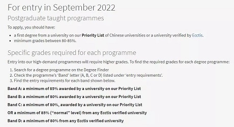 整体来看,针对中国本科背景毕业、2022年9月入学的申请,爱丁堡大学将考虑本科院校在Priority List里的学生,各个硕士专业被分为BAND A\B\C\D四档,均分要求在80-85%。