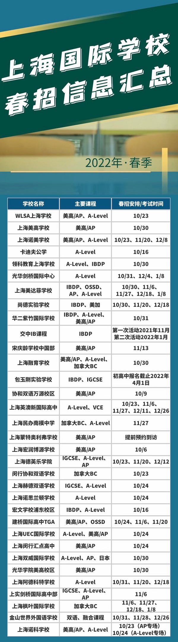 10月正值国际学校春招高峰季,每所国际学校都推出了自己的招生办法和时间点,具体如下: