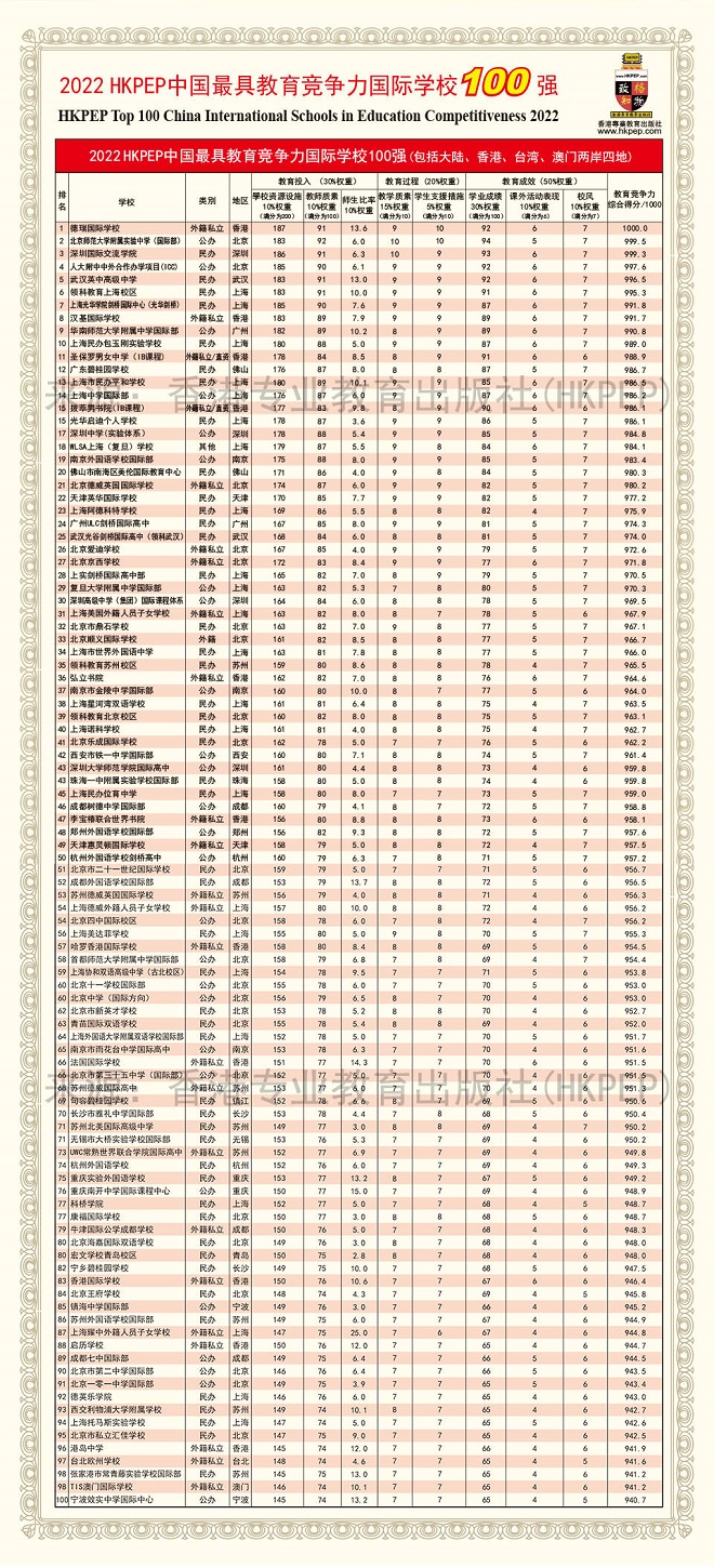 在众多国际学校的权威排名榜单中,由香港专业教育出版社发布的《2022 HKPEP中国最具教育竞争力的国际学校100强》榜单特别的醒目,这个榜单基于联合国教育、科学及文化组织出版的统计年鉴有关国际通用的教育指标,采用“教育投入—教育过程—教育成效”的评比架构,具体衡量国际学校教育竞争力评选体系及其一级、二级、三级共63项教育指标,综合评估了中国两岸四地(内地、香港、澳门、台湾)国际学校的教育竞争力。