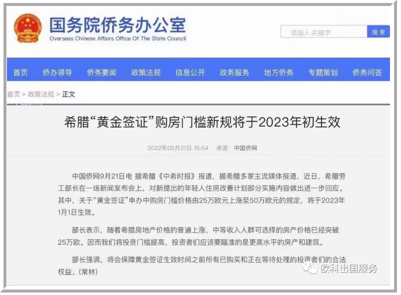 2022年9月21日,国务院侨务办公室也报道了希腊买房移民涨价的相关消息!