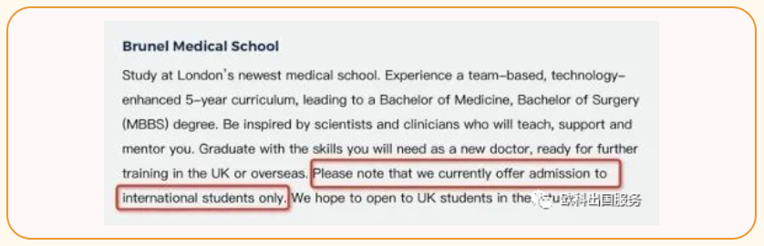 除了来自英国教育部发言人的积极消息之外,根据英国《泰晤士报》的报道,英国某些大学甚至开设了仅招收、或主要招收留学生的医学院,主要的大学有:伍斯特大学、布鲁内尔大学和切斯特大学。