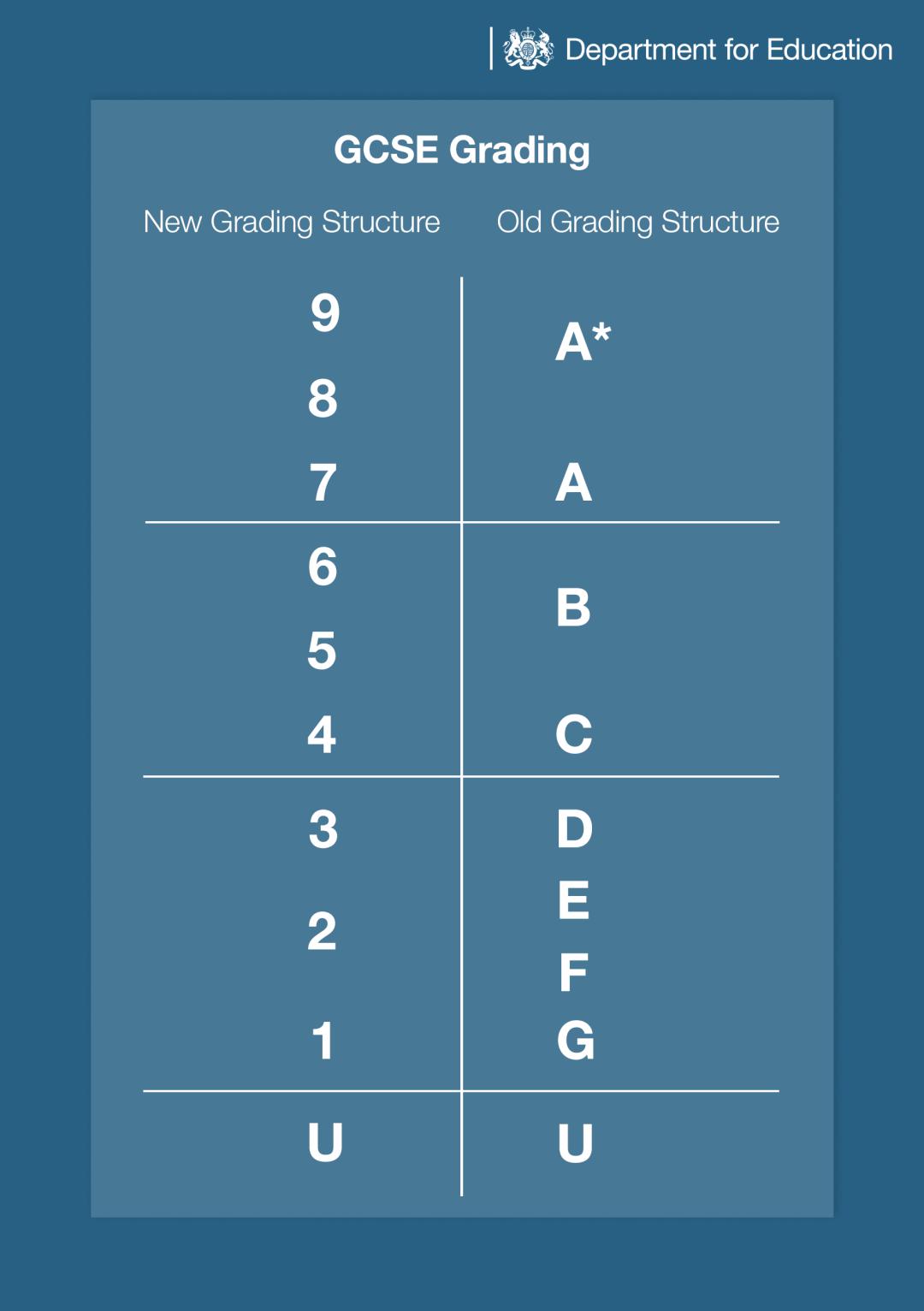 评分等级方面,经过改革之后,GCSE的A*-G的旧评分标准逐步被新的9-1评分标准所取代。等级9是最高的等级,而等级1将会是最低;9-7相当于之前的A*-A;6–4相当于之前的B-C;3-2相当于之前的D-G;在旧的评级制度下,等级C代表合格。在新制度下,这条界线会定在等级4。新的评分模式可以更好地对高分学生的分数进行细化区分。
