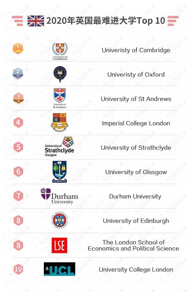 很多申请英国大学的学生都觉得学校排名好,申请自然难!但是,查看了《每日电讯报》之前公布的英国最难进的十所大学,突然发现,G5居然没有占据前5名,有哪些绩优股抢了G5的风头呢?十分好奇(注:这份榜单是以英国各个大学2017-2018届本科新生的UCAS入学平均分作为评判标准的。浅显点说,主要看申请这些学校的大牛们的入学成绩来论英雄滴~)。