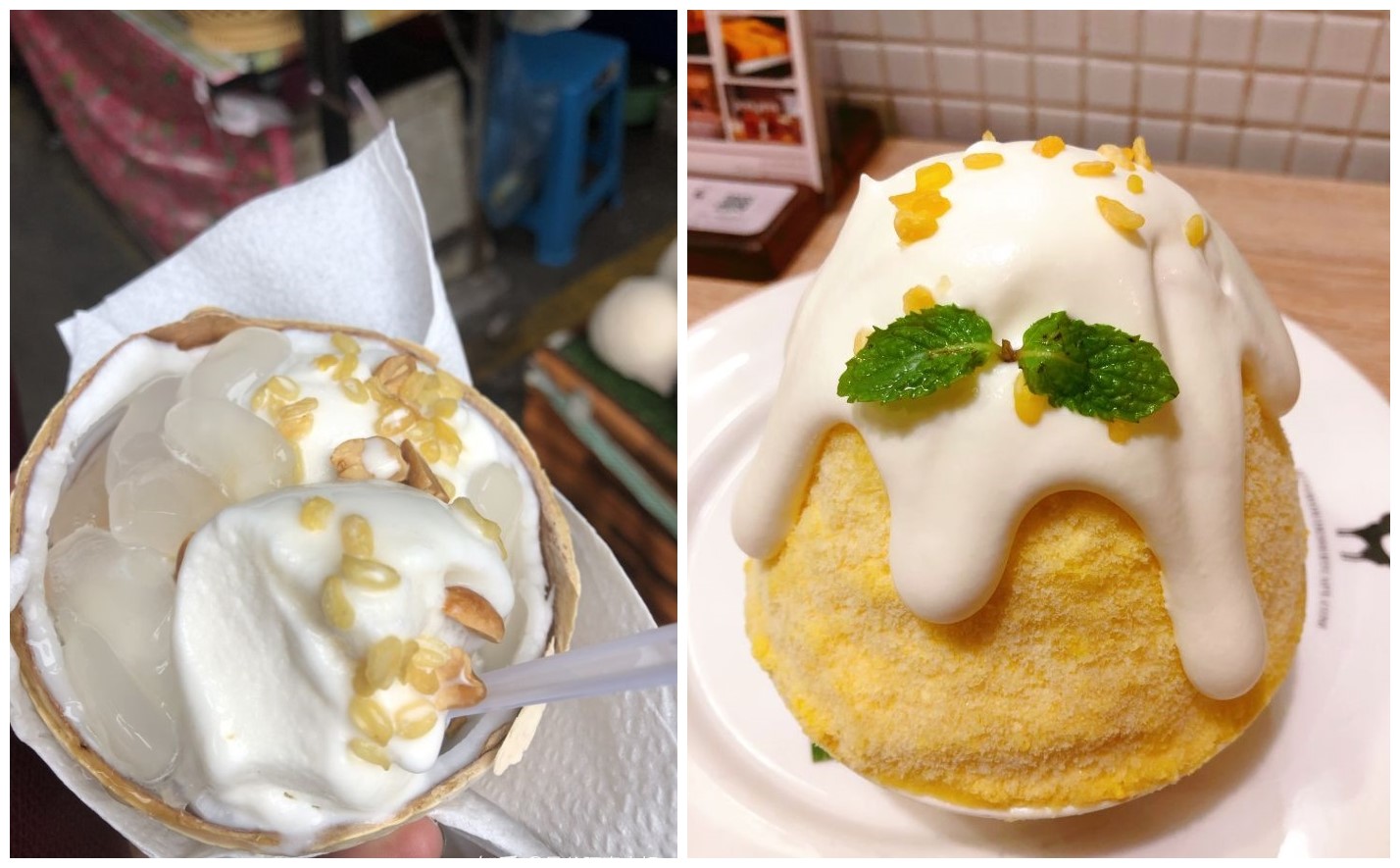 还有Ms S分外推荐的椰子冰激淋,Ms S 不止一次叮嘱说:”如果在街头看到了,千万别错过,绝对不输哈根达斯的美味冰激淋,口感绵密,椰味浓郁,直接把椰子肉刮下来放在冰激淋上,撒上麦仁,花生碎,葡萄干,还有一种脆脆酥酥的果仁,实在太好吃了!我刚来泰国的时候,守在冰激淋车边,吃光了三份才心满意足的离开……“