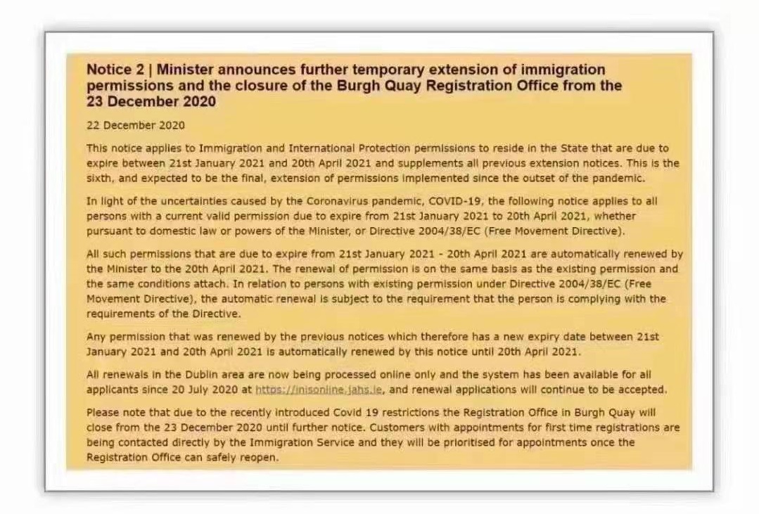爱尔兰司法部自2020年4月起已取消投资移民申请的窗口期限制,2021年预计会延续该政策,2021年内任何时间都可以递交投资移民申请。除此之外,从2020年3月将3月20日至5月20日之间到期的签证自动延期2个月以来,爱尔兰已经实施了5次自动续签签证。近日,移民局又发布了第六次自动续签通知:该通知适用于将于2021年1月21日至2021年4月20日期间移民和国际保护居留许可到期且居住在爱尔兰的居民,并补充以前所有的延期通知。这是自疫情开始以来实施的第六次,预计也是最后一次延期许可。