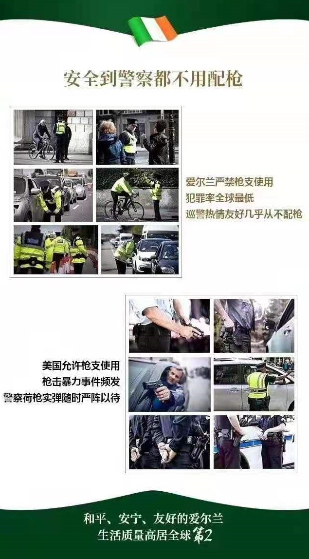 见证了美国的混乱,不禁让我们再次体会到控制枪支的重要性。爱尔兰的和平安宁也体现在其枪支管控方面。爱尔兰《1925年火器法案及修正案》等法案以法律形式规定了爱尔兰在枪支使用方面为“严禁”。在爱尔兰,枪械的使用有严格的控制标准,没有持枪许可证便携带各类火药武器的行为均属严重违法行为,即使是在巡街的警察平时也不配枪。全面禁枪制度保证了民众安全,大大降低了恶性枪击事件。