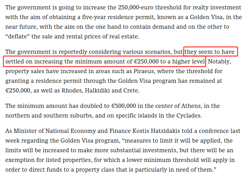 希腊国家经济和财政部长哈齐达基斯近期在有关“黄金签证”计划的会议上说:当局将采取限制“黄金签证”计划的措施,提高门槛以吸引更多实质性投资,但已上市的房产将获得豁免,对其将适用较低的最低门槛,以便将资金引导到特别需要的房地产类别。